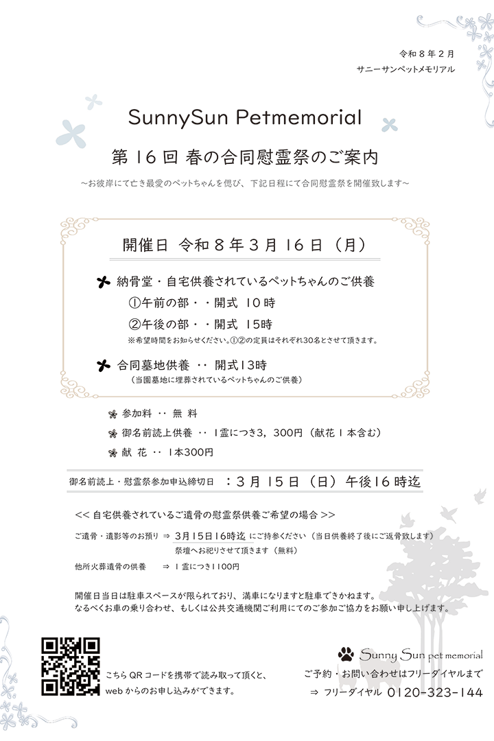 この度、春のお彼岸にて亡き最愛のペットちゃんを偲び、下記日程にて「春の合同慰霊祭」を開催致します。